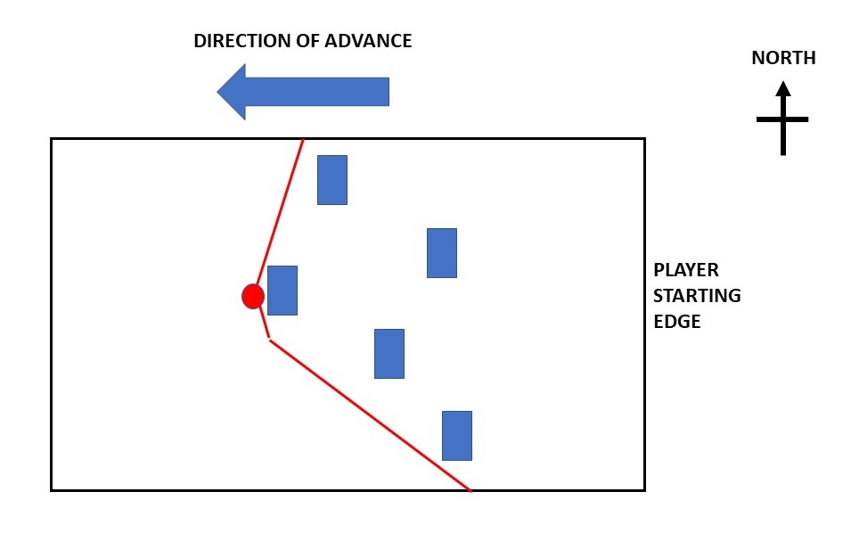 A notional "front line" should be drawn as needed as the game progresses (the red line in the diagram), behind which everything is in friendly control - this is the area which is currently in possession/control of player forces (the blue boxes above are player units). The line is drawn to connect the front of each friendly unit that is in the first line facing the enemy, with gaps between them of no more than 12 inches, and not including terrain where enemy units could hide unless friendly troops have entered (buildings, etc.) Any area passed through is assumed to be under player control unless the scenario specifies otherwise. The furthest-forward point of this line should be identified (the red dot). In case of ambiguity, the game master can decide, or it can be diced for. Use this as the center-point for determining relative compass directions. In the example shown, an enemy unit appearing to the West would be directly in front of the red dot, at the specified distance. An enemy to the North-West would appear to the front and nearer to the top of the map (etc.)