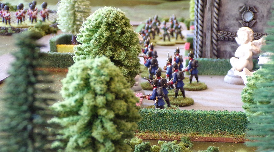 Marauding Prussians deploy in the garden at Lord Balfour's country estate.