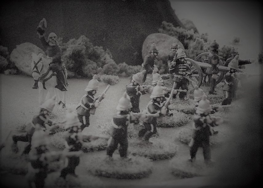 This system does not require specific types or sizes of enemy or player units, since these will be different for each player's collection. Instead it uses the concept of a "unit" of one of several types. It is up to players to decide what a unit will be for their game. (Typically, we use 12-24 figures for an infantry unit, 6-12 figures for a cavalry unit, a gun and 4 gunners for artillery, a machinegun and 3 crew for a machinegun, and artillery observer teams of 2 or 3 figures. Each command of 4-6 units will have a general, and might have a musician and standard-bearer in one of its infantry or cavalry units, and maybe a Medic unit.)