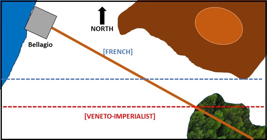 The situation is that the French have found themselves trapped against the mountainous terrain and lakes of the region to the north by the unexpected appearance of a force of Imperial troops, Venetians and local levies. They are cornered, and it is a fight to the finish.