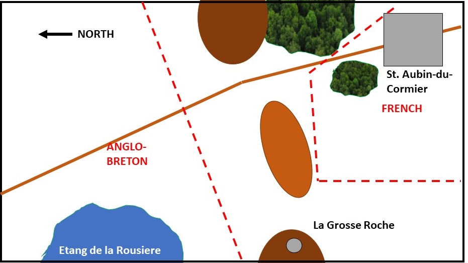 The Anglo-Breton forces may set up anywhere to the north of the line shown on the map. The French must set up inside the area indicated (they were caught unprepared for battle by their adversaries, who foolishly gave them time to deploy.)