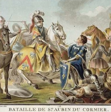 The Anglo-Breton forces have encountered the French army, unprepared for battle, in a wooded area outside the town of St. Aubin-du-Cormier. Despite the urging of some Breton commanders to attack before the French had deployed, this was not successfully done, and the French artillery was able to cause considerable damage to the leading Breton formation. Exploiting a gap in the Breton lines, the French were able to break through and destroy their army.