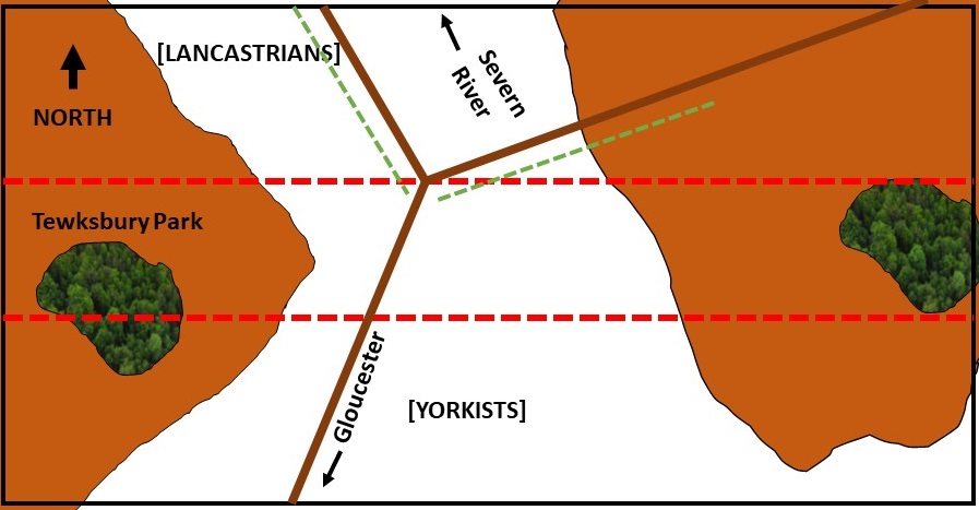 Historically, there was some fear of an ambush on the part of the Yorkists, and they deployed a mounted force in Tewkesbury Park to deny its use to the enemy. In this game, either of the woodlands may be used for this purpose by either side. Before play begins, unbeknownst to their opponents, each side may choose to deploy a unit in one or both of the woods on the flanks of the battle area. If both sides choose to deploy in such positions, the units will be revealed at the start of play, at a distance of 6 inches away from each other, within the feature, or optionally at its near edge. If only one side makes such a deployment in either feature, that unit will remain hidden until an enemy enters the feature, or they choose to make a visible action (moving or firing). These units fall under the command of the nearest battle commander (right or left, as appropriate).