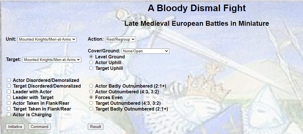 A Bloody Dismal Fight is designed to support remote play, using miniatures and cameras, and to provide an easy system for regular convention play. It is decisive, easy to learn, and produces relatively short battles (2-3 hours is typical), while employing armies of goodly size (as compared to some fast-play games in the past). It is designed for use with 25mm/28mm figures, as those are the easiest to see both on-screen during remote play and at the convention table. Armies are challenging to maneuver, but not impossible, and the game rewards the thinking commander as well as the bold one, effectively capturing the feel of late-Medieval combat.