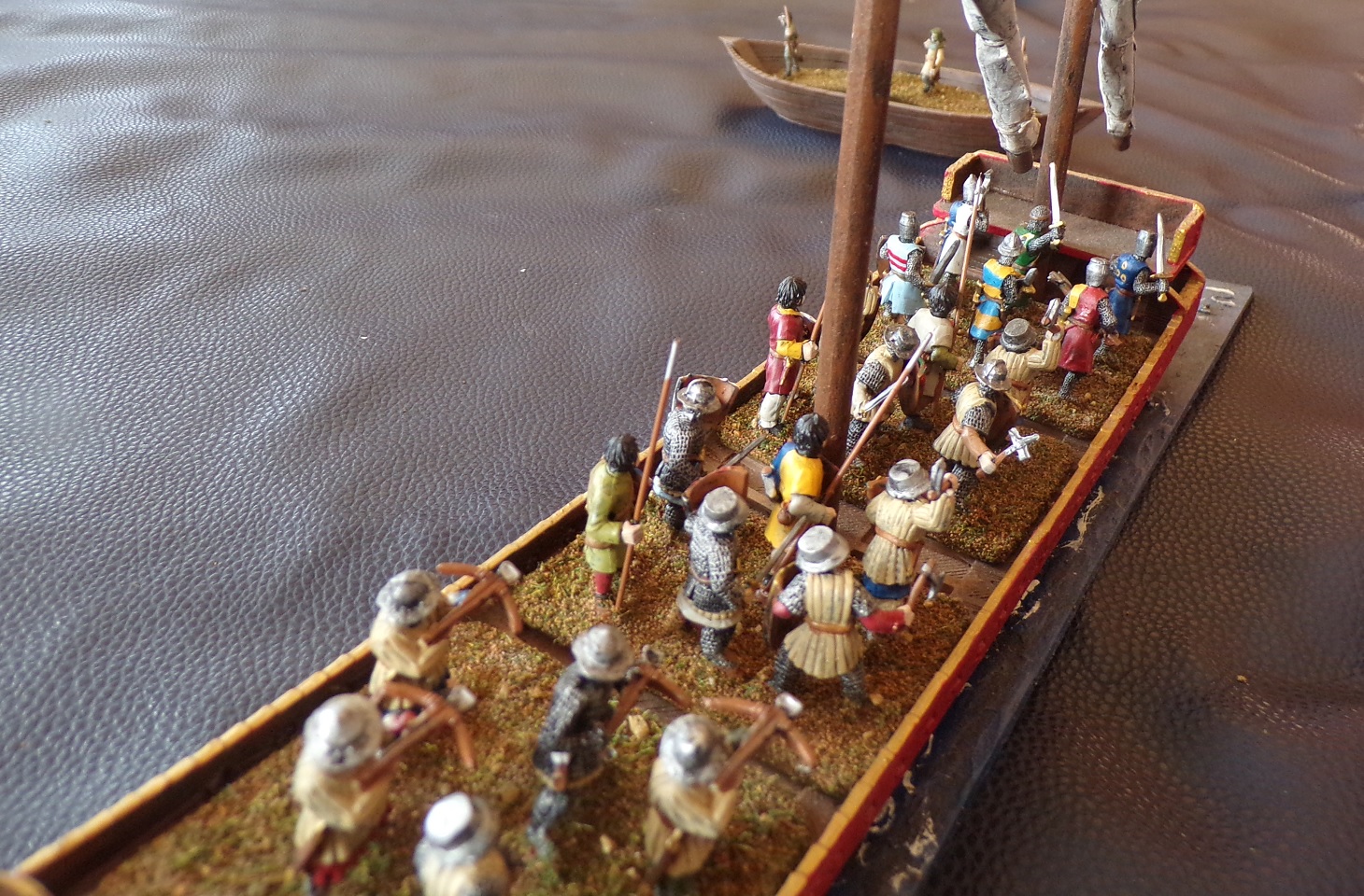 Naval warfare during the Medieval era is not frequently gamed, but it does offer some interesting possibilities. Engagements such as the Battle of Sandwich in 1217 and the Battle of Zierikzee in 1304 have fleets of Western European cogs and smaller vessels clashing, and many actions in the Mediterranean (and elsewhere) add galleys to the mix. When you start looking into it, you will find many possibilities for depiction on the tabletop. Ships were not yet carrying artillery for use at sea during the feudal era, so ship-to-ship fighting included smaller missile weapons, boarding actions, and ramming.