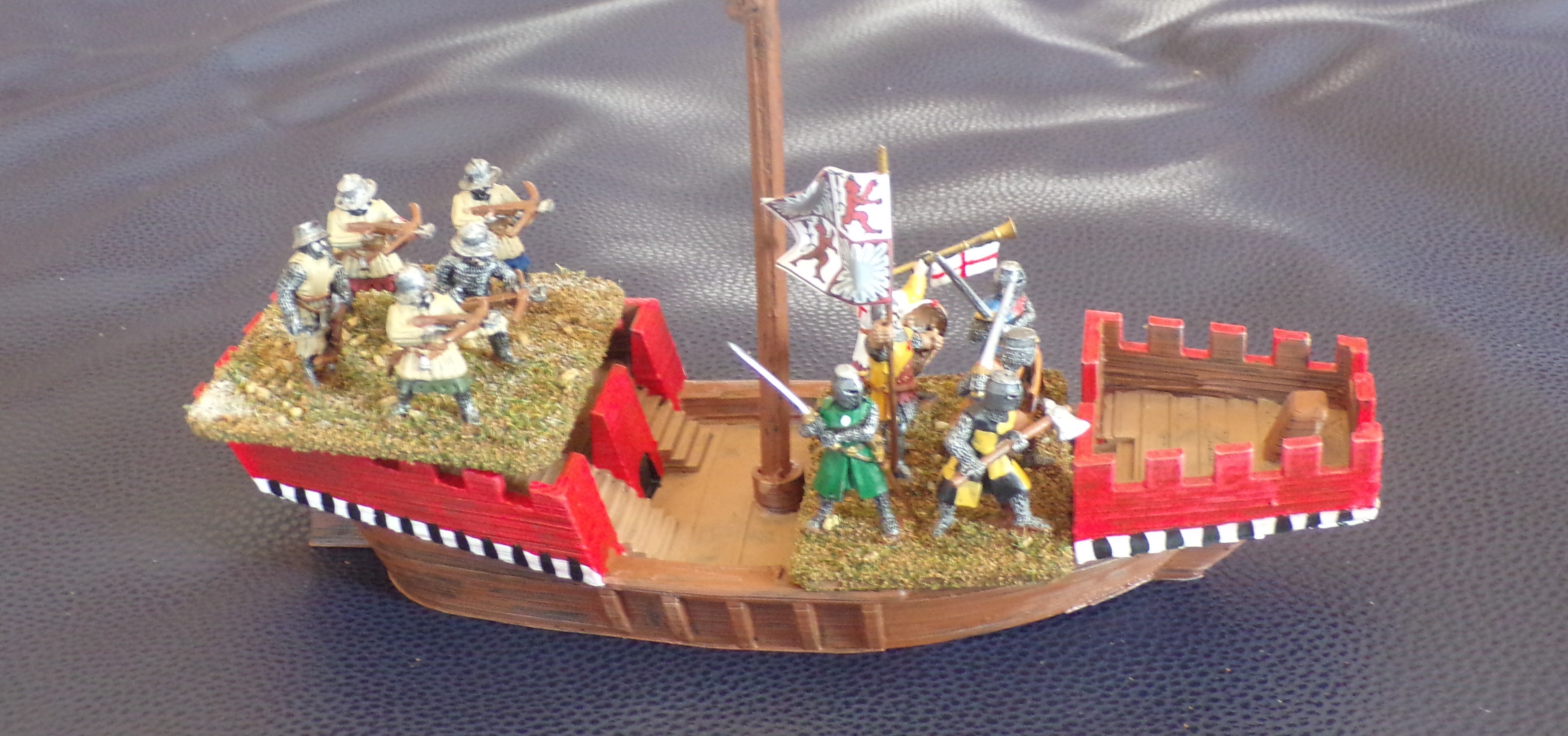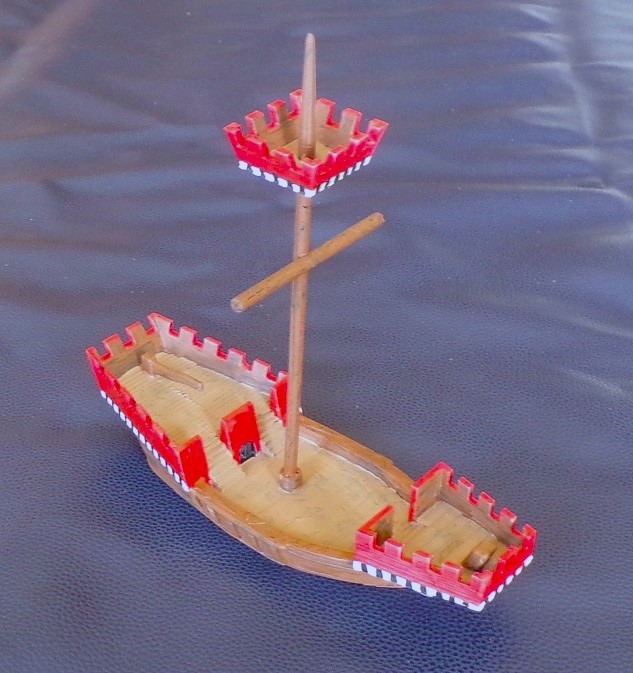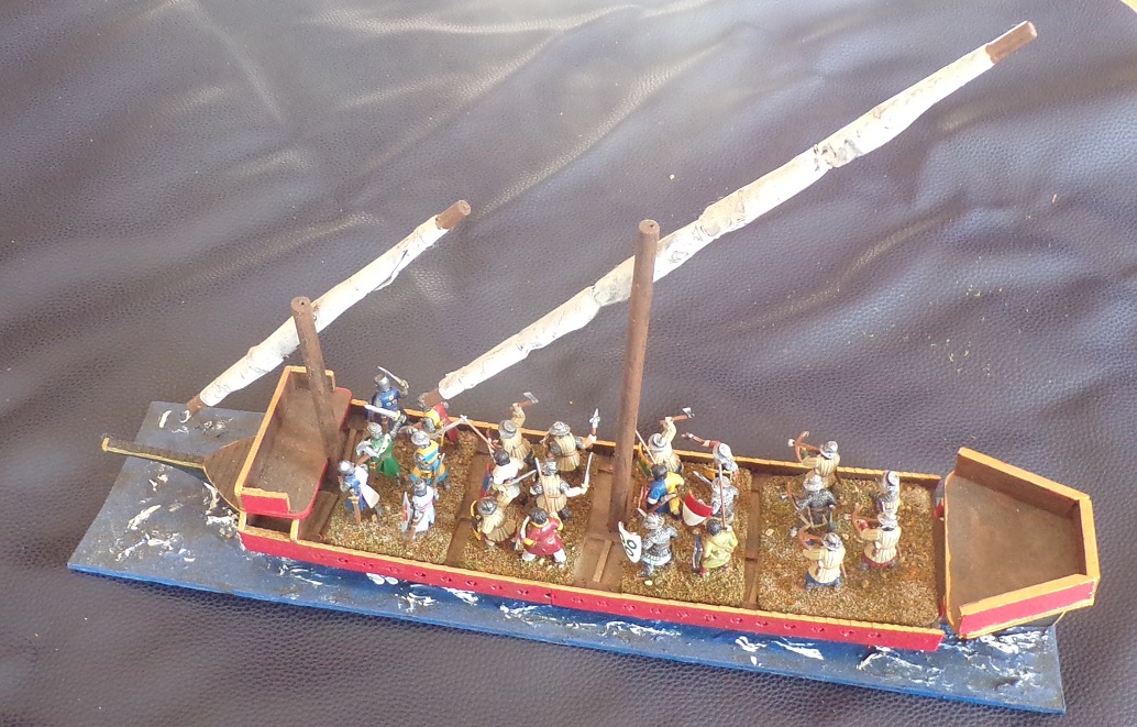 Small cogs were the typical trading and military vessels of the period. They can hold 3 bases of troops, but only 2 on deck at any given time (the other is in the hold). They provide cover for troops in the "castles" fore and aft.