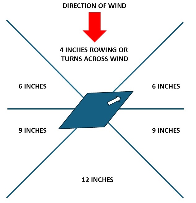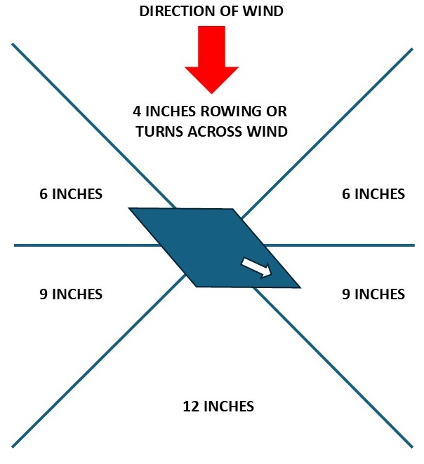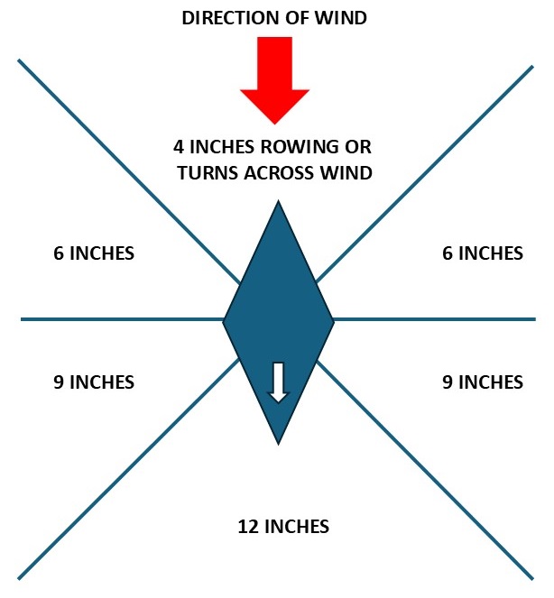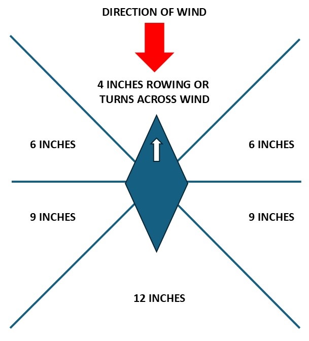 Ships beating into the wind (or "tacking"), in the 45-degree arc toward the wind direction, and forward of a line perpendicular to the direction of the wind, will sail 6 inches. Vessels under oar power will move 4 inches, except for galleys, which will move 8.