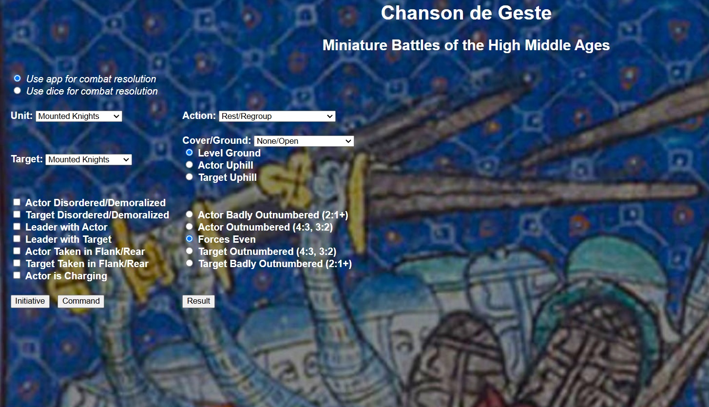The game is designed to be used with 28mm miniatures, and is intended for club and convention play. but also works well for remote games. In all of these settings, the larger figures show off this colorful period to an advantage, and make for a better spectacle. It is possible to use smaller figures by adjusting scales and distances or increasing the number of figures per base. Unlike some popular rules sets for the period, Chanson de Geste is designed to recreate in full the battles of the era as historical simulations, rather than small skirmishes or mythical actions. Despite this, the games play quickly, in part as a result of the use of a device or computer to speed the action. Players may choose to let the device do all the randomisation for them, or may use traditional six-sided dice. Only one device is required - used ideally by a GM - but more can be used simultaneously for large games.