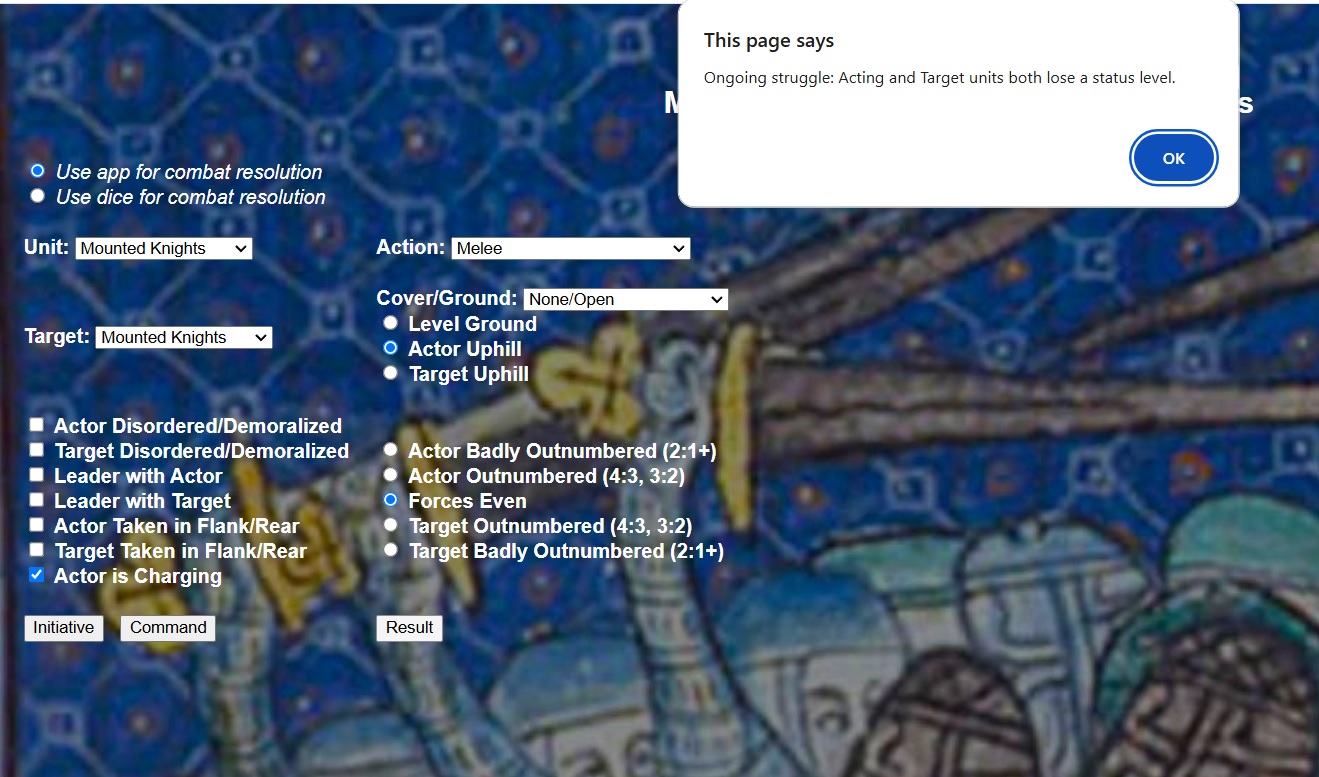 The screen below shows a result - a unit of knights has made a Melee action after charging into an enemy group of knights. The two units are the same size, and they are fighting in the open, but the attacker has charged downhill. The defender has gotten lucky - despite the advantages of the charging unit (height and impact), the result is a tie, throwing both units into disorder and continuing the fight (they each take 1 status level of damage, which equals disorder since neither were disordered or demoralized at the start of the combat - see below).