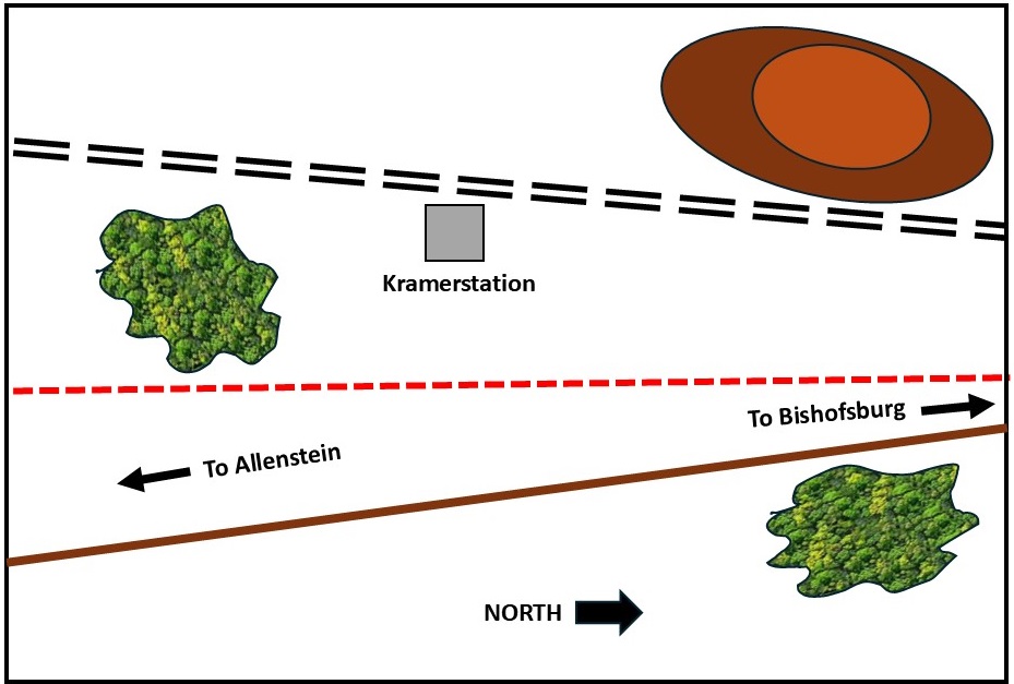 The table shown below is 4' x 5'. All distances are doubled for use with 25/28mm. The dotted black line is the rail track, which provides soft cover to units behind the embankment. The station - Kramerstation - provides soft cover in its wooden buildings. The hill is rough and provides soft cover, as do the woods.