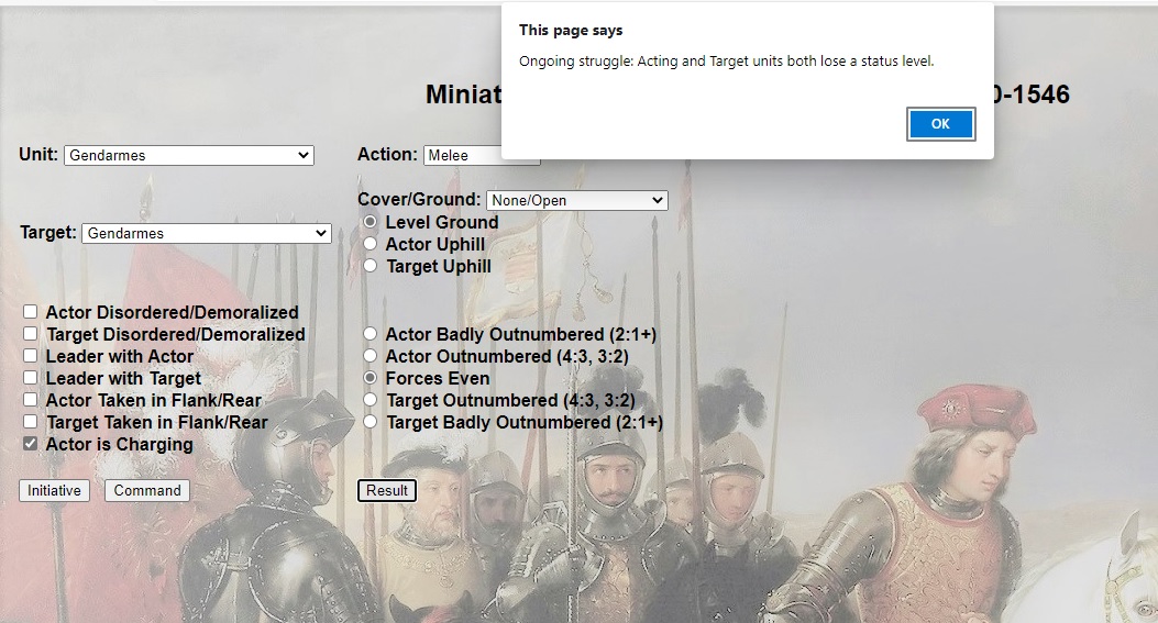 The Initiative and Command buttons are in the lower left-hand corner. Using these buttons requires no other fields to be set - you simply click, and a result box pops up, telling you which side has the initiative, or how many activations the Leader who is given the Initiative may use.