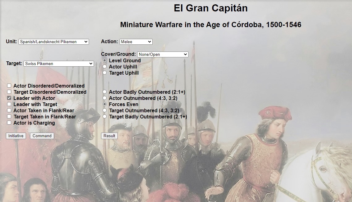 The Italian Wars spanned more than half a century, featuring the pagentry of the late Middle Ages alongside some of the most colorful mercenary troops to ever take the field, the Landsknechts and the Swiss Reislaufer whom they imitated. The general who was responsible for the dominant style of warefare in this period - and the first effective use of massed gunpowder weapons - was Córdoba. He was the father of the Spanish tercios, the originator of true pike & shot warfare, and the leading military genius of his age. He was called "El Gran Capitán", the great captain.