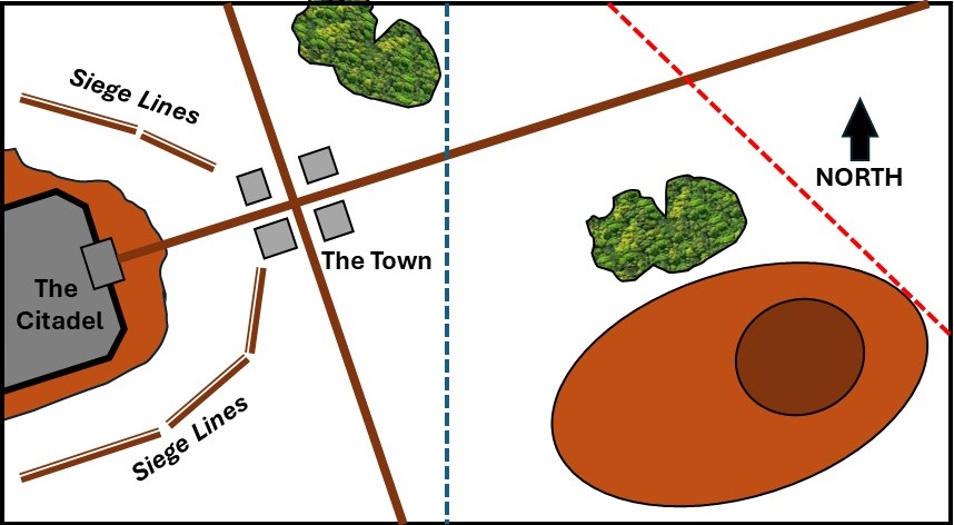 Prussian forces will set up anywhere to the west of the blue dotted line, but no closer to the Citadel trhan their siege lines. The French garrison forces set up inside the Citadel. Other French forces set up to the north-east of the red dottted line, or may move onto the table from the edges in the northeast corner, behind it.