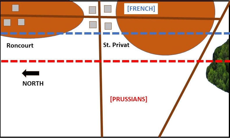 The Prussian XII Corps is still largely intact, as is the remainder of the Guard (1st Brigade), supplemented by a few additional units from nearby formations. It is assumed that the historical orders to XII Corps to march northeast, around the end of the French line have been countermanded, and they are pulled back to assume a defensive role as the French mass for their counterattack.