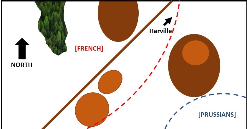 Prussian III Corps and X Corps have been pushing hard to catch up to the French, swinging south through Thiaucourt and turning north. The French deploy Frossard's 2nd Corps to hold them off as the rest of the French march west. If the Prussians can get around Frossard's flank at Harville, then a more general engagement will be unavoidable to prevent the French from being destroyed in their march columns.