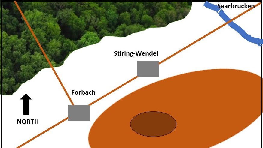 The map shows the area around Forbach, Stiring-Wendel, and the nearby ridge where most of the fighting took place. The hill is rough and provides soft cover, as do the woods. Forbach and Stiring-Wendel provide hard cover. The Saar may only be crossed at the bridge.