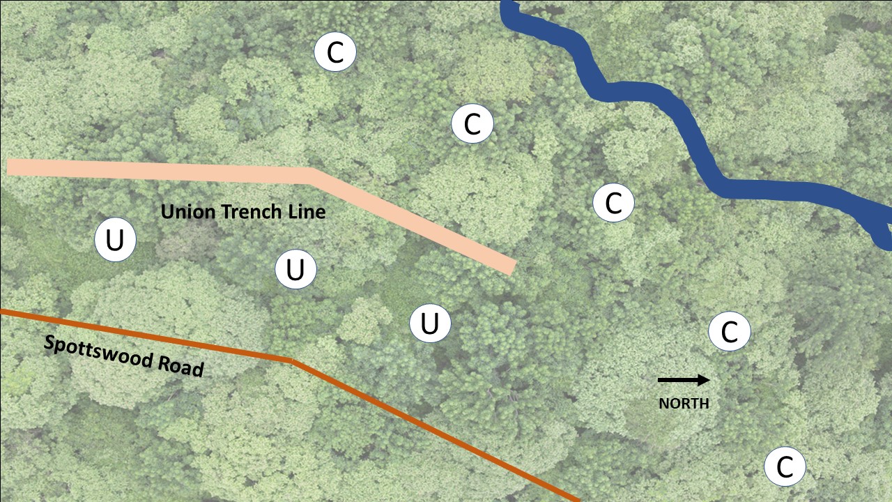 The map below shows the tabletop and the positions of the Confederate (C) and Union (U) troops at the beginning of play. The entire tabletop is covered with woods, aside from the road and the waterway. The woods will provide light cover and limit visibility to 6 inches. It impedes movement. The waterway - Flat Run - is a small creek which is fordable at any point, and counts as rough (no worse than the surrounding woods). The Union trenches have been occupied all day with only desultory fighting, and are assumed to provide hard cover against attacks from the West, but not from other directions.