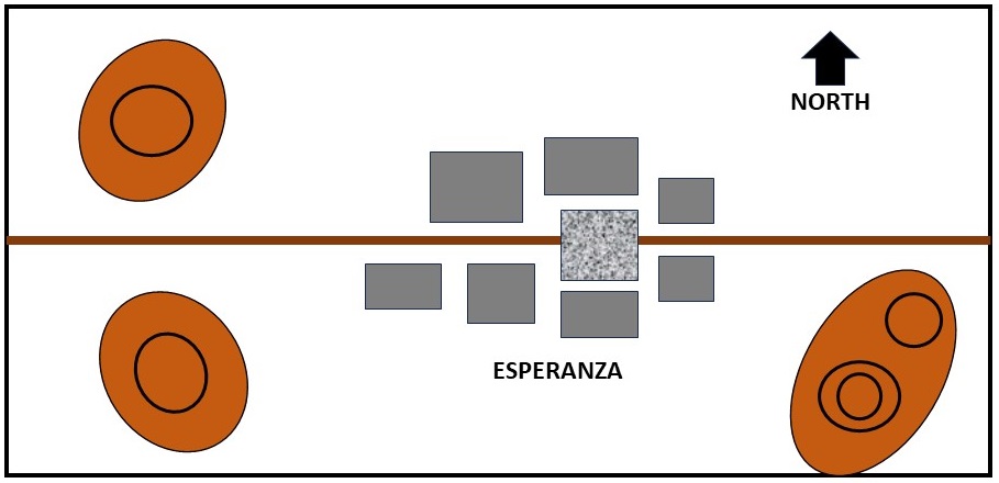 The map below shows the tabletop. The hills are rough and provide soft cover because of the concealing vegetation. The houses in the town provide hard cover. There is an open plaza in the center.