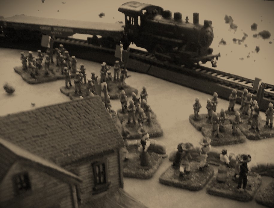 Trains do not provide any protection from fire in the game, unless they have been armored or sandbagged. If they have this provides hard cover, just like it would elsewhere. Machine Gun and Artillery units deployed on trains (required to be specified at the start of the scenario) will always make Moving Fire if the train on which they are emplaced has moved. Units emplaced on trains or being carried as passengers are assumed to be able to target anything out any side of the train which is not obscured by another car in the train, regardless of the facing of the models. Passenger units on trains which are required to Fall Back will ignore this result, remaining in place. Moving trains cannot be Assaulted except by Cavalry units, and are accorded Soft Cover modifiers to reflect the difficulty of this type of attack. Even this is not permitted if the train is making a March action during the turn. While passenger units may be Asaulted at any point on the train where they are positioned, the locomotive must be Assaulted if the target is the train itself. A unit is not allowed to perform an Assault in a turn during which it detrains.