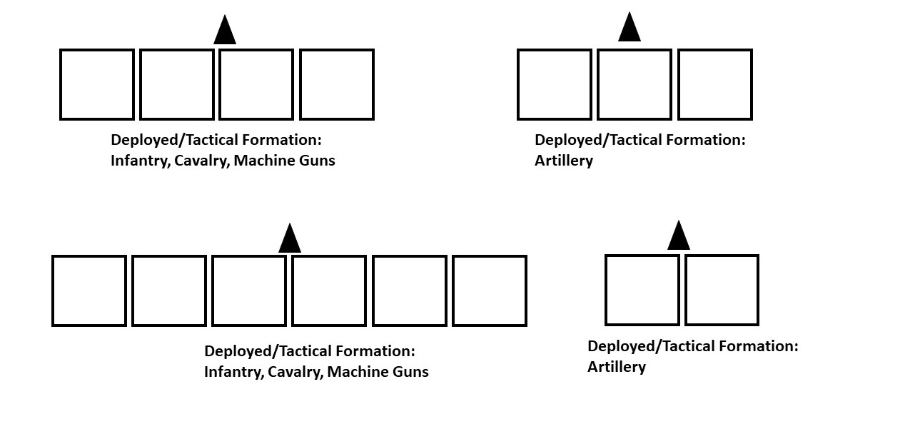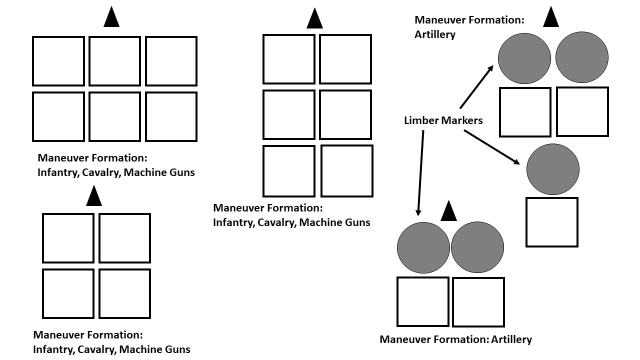 The diagram above shows 6-base and 4-base maneuver formations for Infantry, Cavalry, and Machine Guns (although usually you will have fewer bases in Machine Gun units). For artillery, 2-base and 3-base examples are shown. Note that the limber markers are only markers, and do not count as part of the unit for determining range, etc.