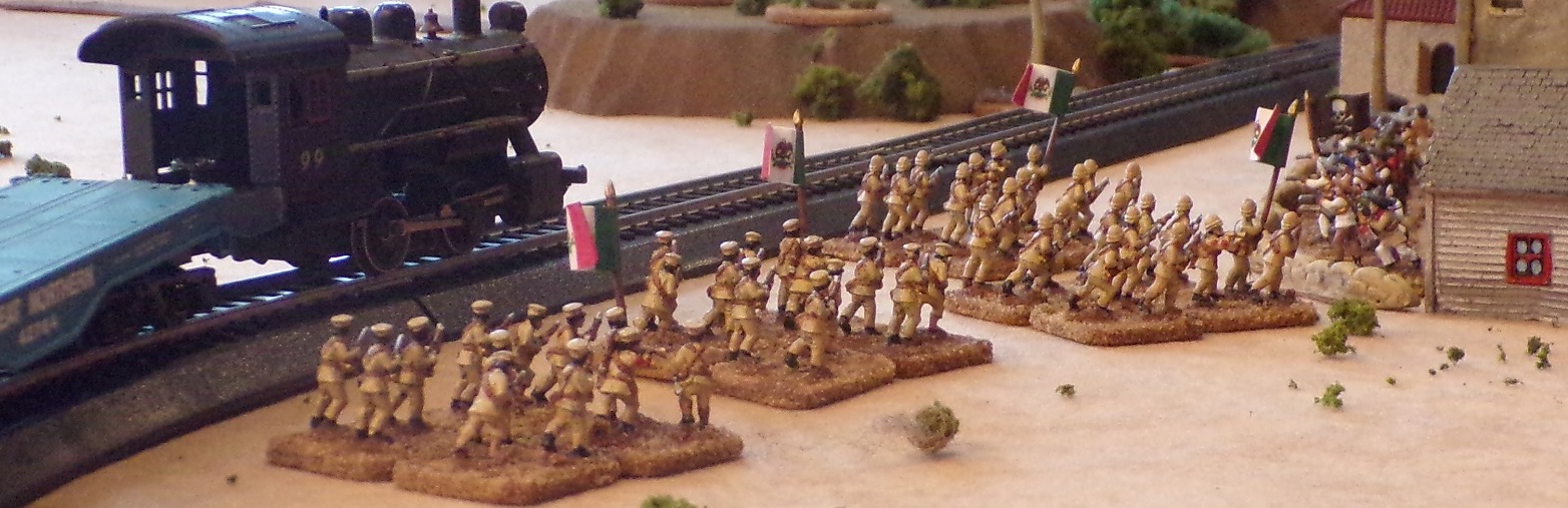 Trains: Trains obviously cannot re-configure themselves on the tabletop, as they will always move along their tracks. Trains count as if in March formation at all times (they are very easy to hit!). Any passengers on trains may have different formations for targeting purposes, however. Artillery and Machine Guns which have been pre-positioned in the train to be able to fire will count as deployed. Infantry and cavalry will generally count as in maneuver formation, with the exception tha badly over-loaded trains may place them into march formation, according to scenario rules. This reflects the fact that they cannot shoot through loop holes in the car sides or avail themselves of whatever cover is on offer, as they will be crammed in everywhere. Note that train cars are assumed to provide some level of protection already, so cover modifiers should only be assigned if the train is additionally armored, sandbagged, etc.