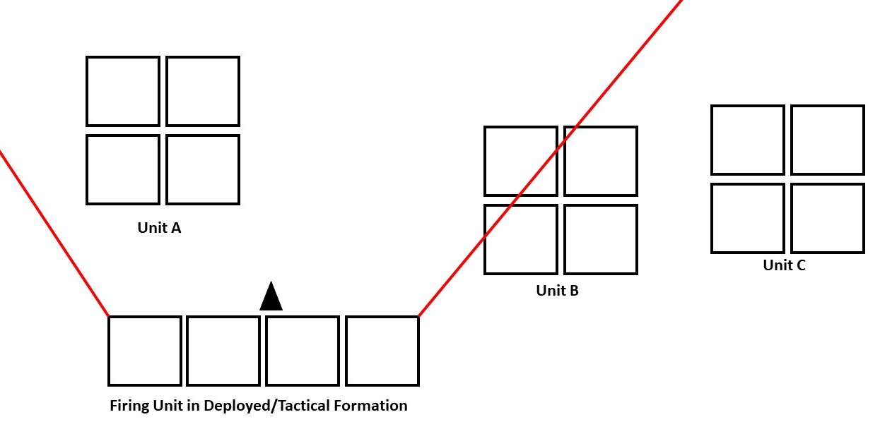In the diagram, we have a deployed firing unit and can see its firing arc - the area between the red lines. All of the three nearby enemy units (Unit A, Unit B, and Unit C) are within the firing range (although distances are not shown), and there is a clear LOS from the firer to each of them. Unit A is completely inside the firing arc, and is a legal target. Unit B is also a legal target, because it is partially inside the arc of fire. Unit C cannot be fired on, because it is outside of the firing arc.