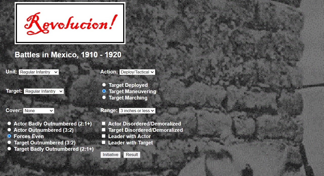 The game app will run on any computer or device which has a javascript-enabled web browser. Multiple versions of the software can be run at the same time in a single game. As a computer-assisted miniatures game, Revolucion! uses a minimalist design. It does not duplicate any of the information which is represented on the tabletop, but functions strictly as a "wargames calculator," replacing the dice-rolling and chart look-ups of other systems. It requires no pre-game set-up: players must only provide figures, terrain, rulers/tape measures (in inches), and a smart-phone, tablet, or computer which can run the game. Optimized for 15mm/18mm miniatures, other scales can be easily accomodated.