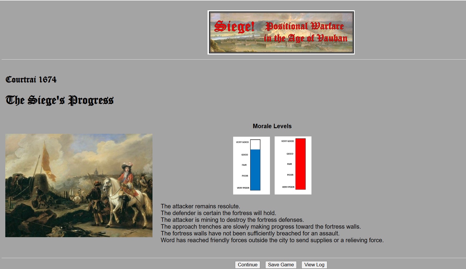 Siege! is a mapless campaign system designed to allow players to conduct a siege at any time during the 16th to 19th Centuries - the "Age of Vauban". It generates a narrative describing the significant events of a siege, some of which require tabletop battles. The outcome of these actions is a major factor in determining who triumphs, but players are not in charge of running the operation - instead they command troops carrying out the orders of their superiors. The app takes care of all book-keeping and generates a running account of the course of the siege, making it easy for players to copy the text and edit it into a full description once the siege has concluded. An entire siege can be conducted over the course of a small number of gaming sessions, and it is possible to use the app as a part of a larger campaign, in which sieges form only a part.