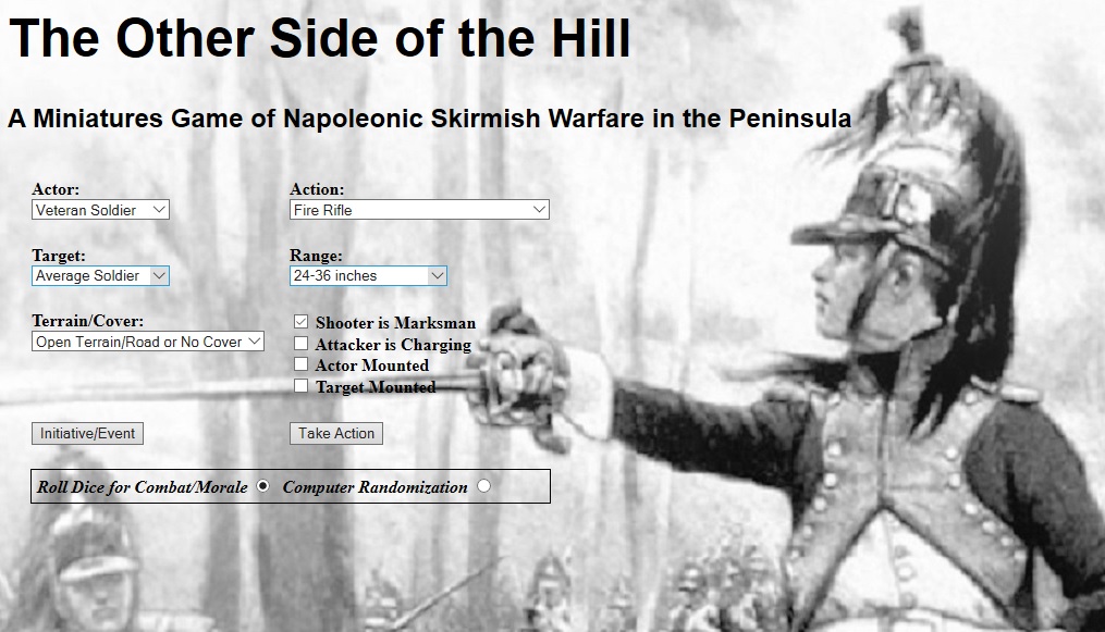 "Scouting Villa Nueva" (Scenario): HTML PDF "Remote Tabletop Wargaming: A First Attempt" (An Account of the Villa Nueva Scenario, run during the pandemic): HTMLSome of the best soldiers of the Napoleonic Wars were the British and KGL riflemen and light infantry forces which preceding the British army everywhere it went in the Peninsula, fighting endless skirmishes against the French forces. This game allows players to experience that war, as depicted in the popular Sharpe's Rifles videos and books. Players fight against the app and the game master, looking for French troop concentrations and patrols, destroying baggage trains, escorting Exploring Officers and confused (and sometimes quite attractive) British tourists, and generally doing the things that riflemen did (er... well, most of the time!).