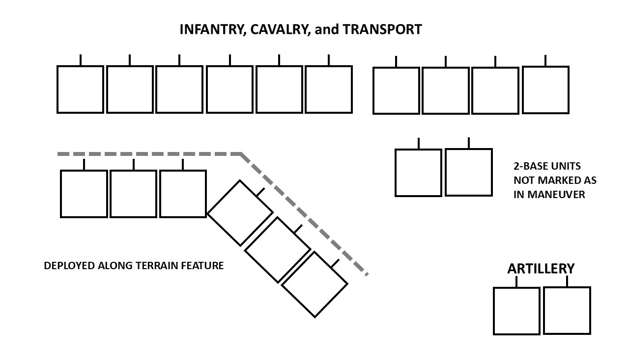 There is an exception to the 2-deep rule above when a unit has only 2 bases. Such units may choose to maneuver with their two bases side-by-side in a single rank, but must be marked as being in a Maneuver Column formation whether in one or two ranks. Similarly, artillery may choose to maneuver in a single base-width column, but this needs to be marked to distinguish it from a March Column.