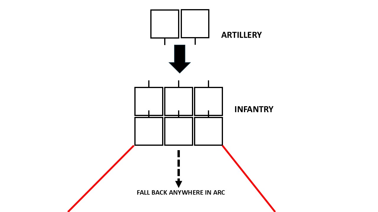 Here, an artillery unit faces an enemy infantry unit. The artillery is deployed. The artillery unit makes a deployed fire action, causing the infantry unit to fall back 6 inches and become demoralized. The infantry unit would move within the arc described by the two red lines, a distance of 6 inches, ending the move without altering its facing or formation, and would be marked as demoralized. It would not turn except as required for its movement to be legal (not within 1 inch of enemy units; not through impassable terrain; not moving so as to end up inside another friendly unit; etc.).