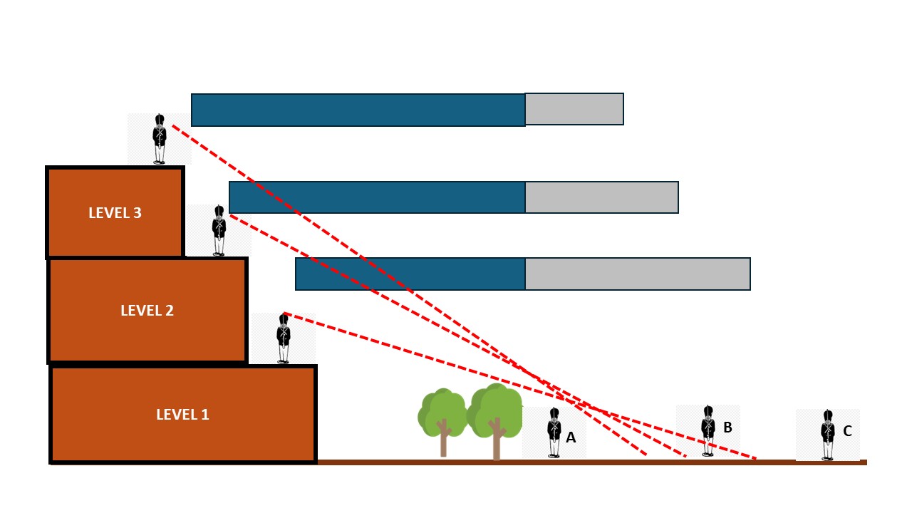 When you go up one level, the same thinking applies but the length of the shadow is reduced by half. Thus, we can tell that target figure C is still visible, target figure B has become visible, but target figure A is still hidden by the shadow of the tall obstruction. When we go to the third level, the shadow is reduced by half again (so now it is only 1/4 of the distance between the spotter and the far side of the tall obstruction). Figure A remains hidden, but the others are clearly visible.