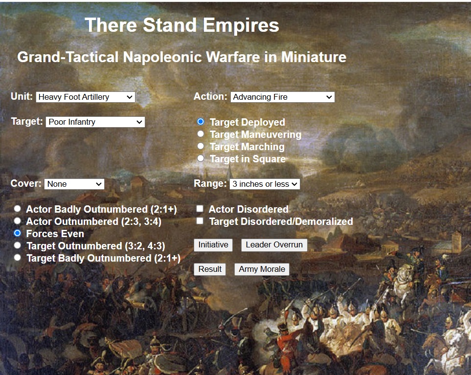 There Stand Empires is a computer-assisted system for miniatures wargames of the Napoleonic Wars at the grand tactical level. Using the brigade as the basic unit of maneuver, it allows entire battles to be fought on a regular wargames table with a reasonable number of figures. Designed for 15mm scales and smaller, it uses a popular basing system for the period. (It can be played in 25mm or larger scales by doubling all base sizes, measurements, and distances.)