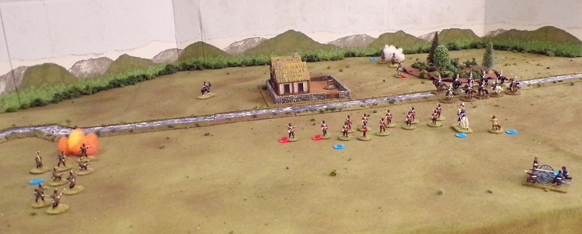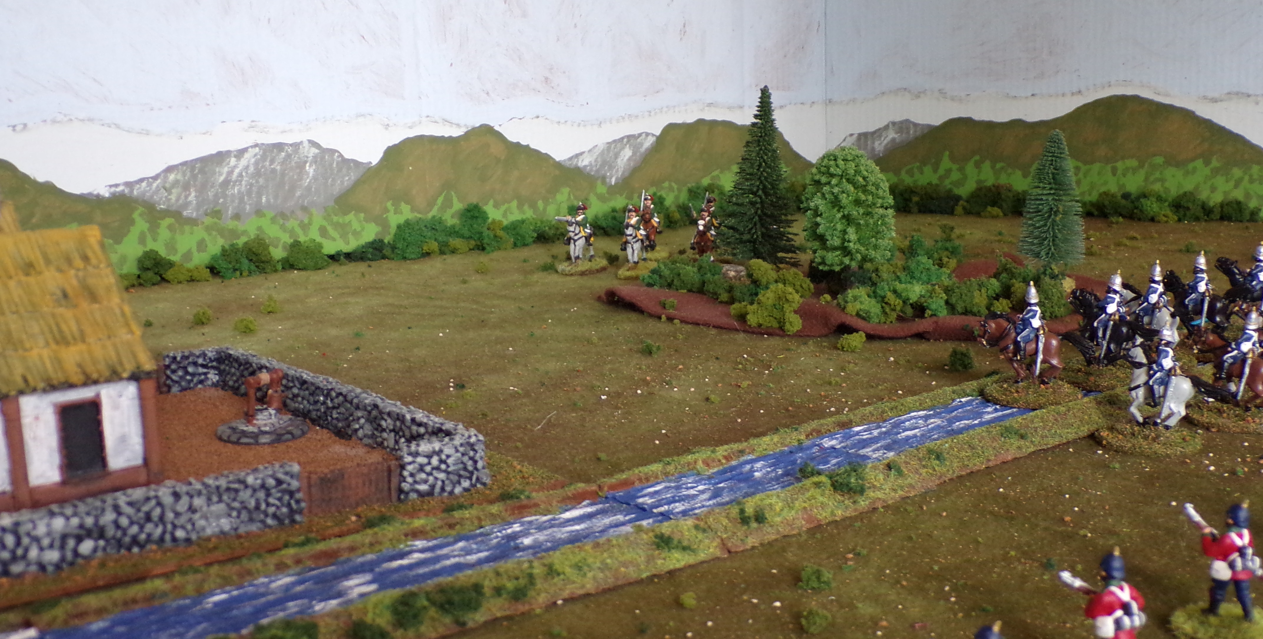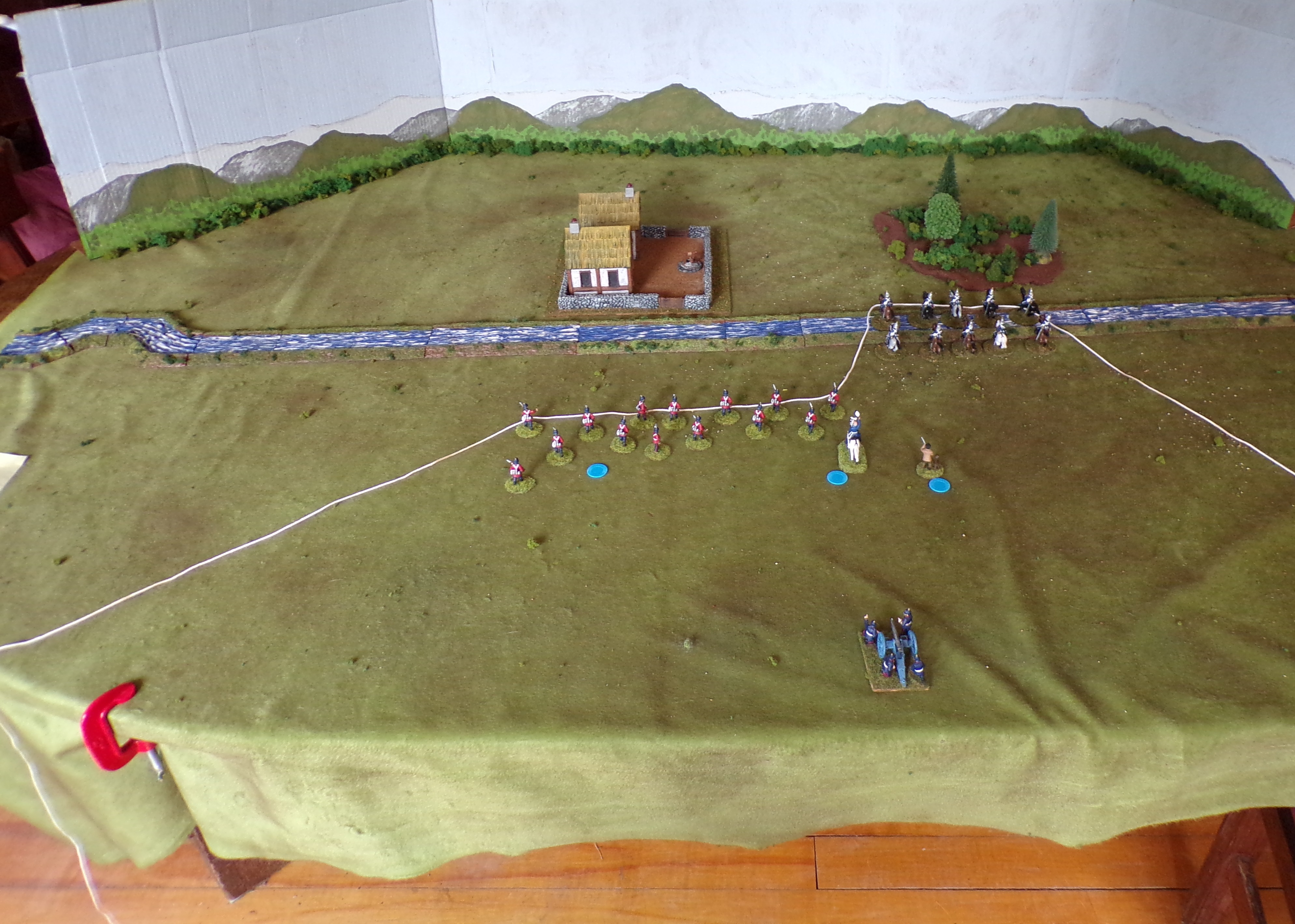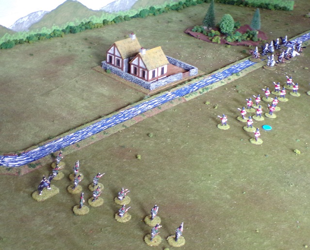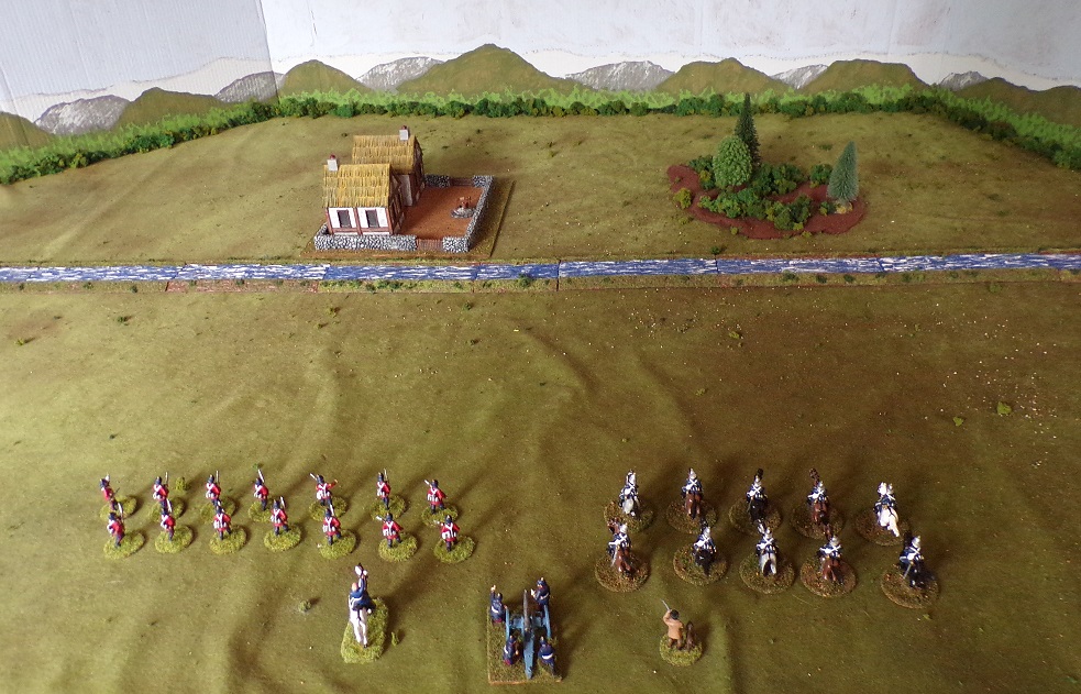 The farm consists of a pair of buildings enclosed by a stone wall. It sits next to a shallow brook which is easily fordable, and will only slow movement by half for any troops moving through it. There is a small copse near the farm, which will be considered rough terrain for movement purposes, and provide cover. Visibility into or through the woods is limited to 2 inches.
