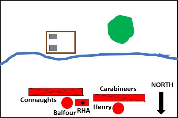 The Player force consists of Lord Balfour (a formerly retired Brigadier-General), his hunting companion Sir Henry Thompson (a crack shot) acting as a civilian volunteer, a gun of the Royal Artillery, a section of the Connaught Rangers (a veteran Irish unit of the regular army), and a troop of the Hampshire Carabineers, a Yeomanry unit. This force is: