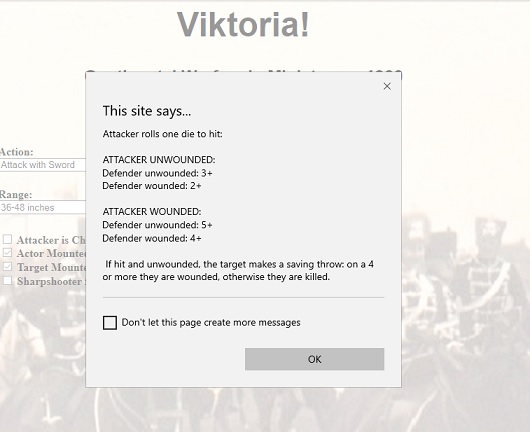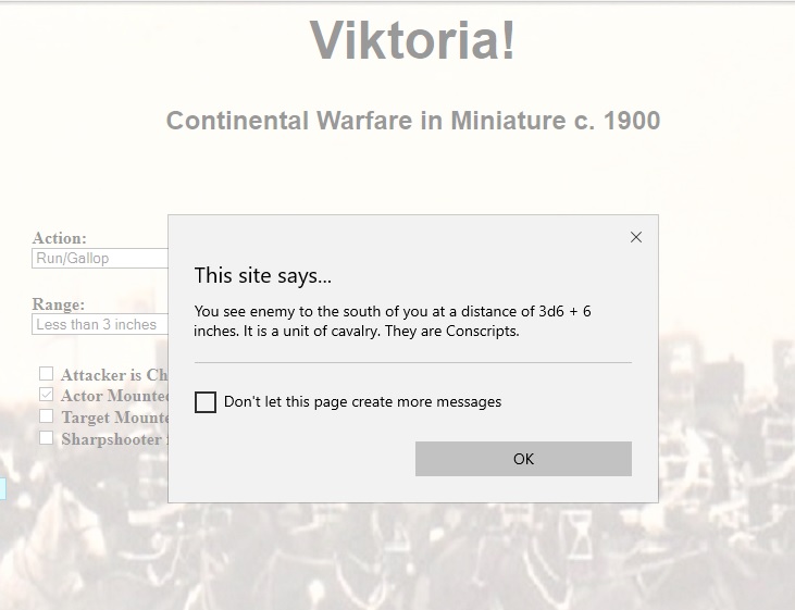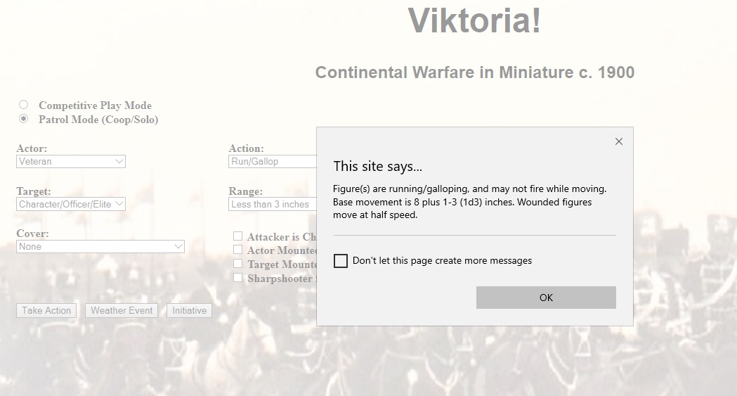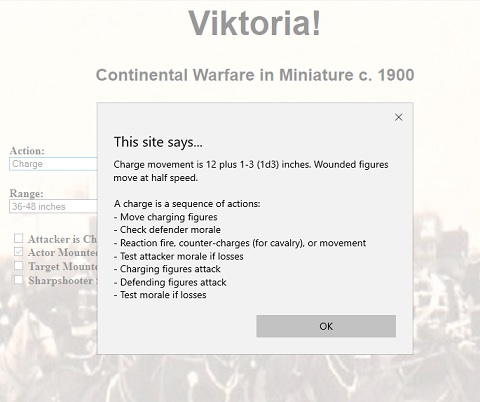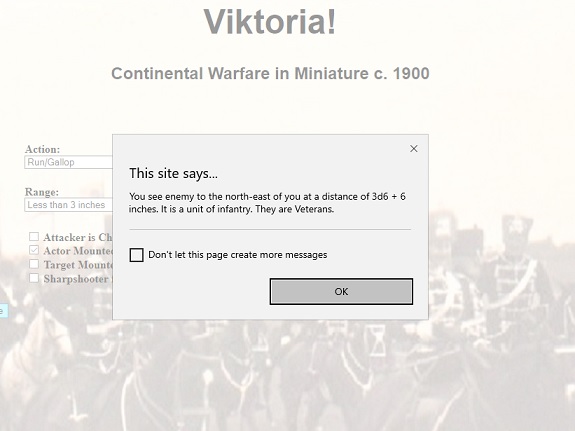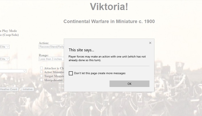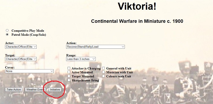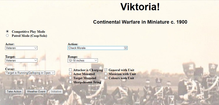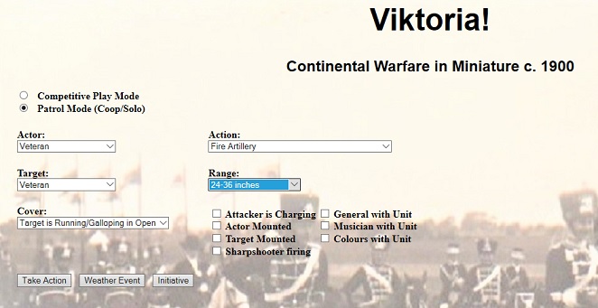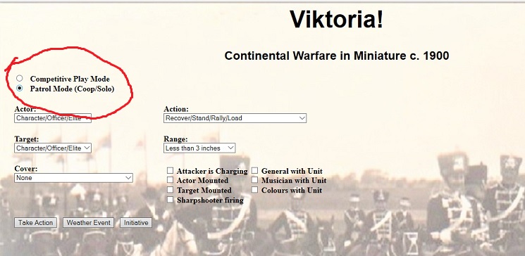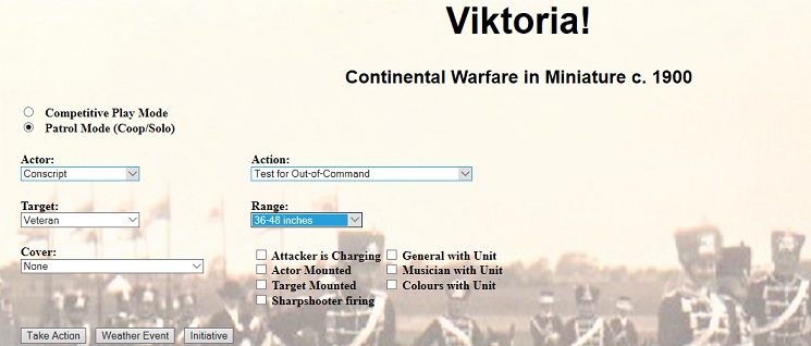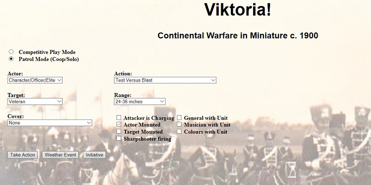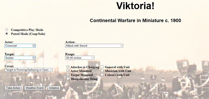 This article explains how the Viktoria! game app is used, by describing the beginning of a game, detailing each stage in terms of what the player and gamemaster are doing (the same person for solo play) and showing both the tabletop and the device screen as they do so. The chosen scenario is very small, but serves to illustrate the basic mechanisms of play. Although the game app can be used to conduct normal player-against-player battles, this one will be done in "Patrol Mode" which is used for solo/cooperative play, and lends itself well to being used as a remote-gaming system.