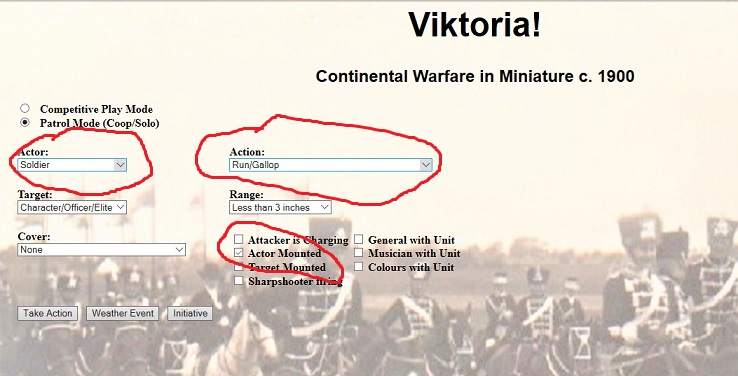 It is allowed for different figures in the unit to make different actions, but at this point that isn't what is wanted. All figures will Gallop. To do this, we go back to the app, and select the Actor and Action fields, and we indicate that the Carabineers are Mounted (these fields are circled in red):
