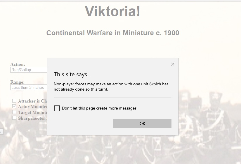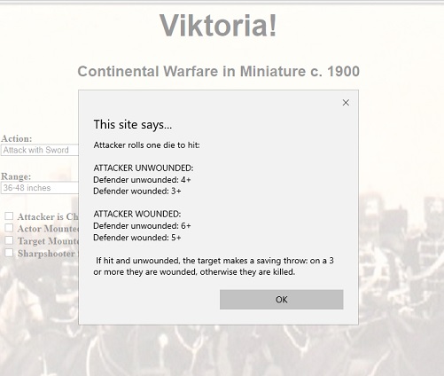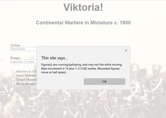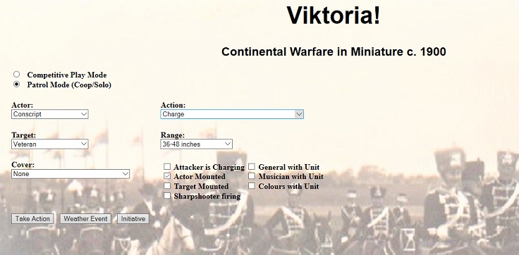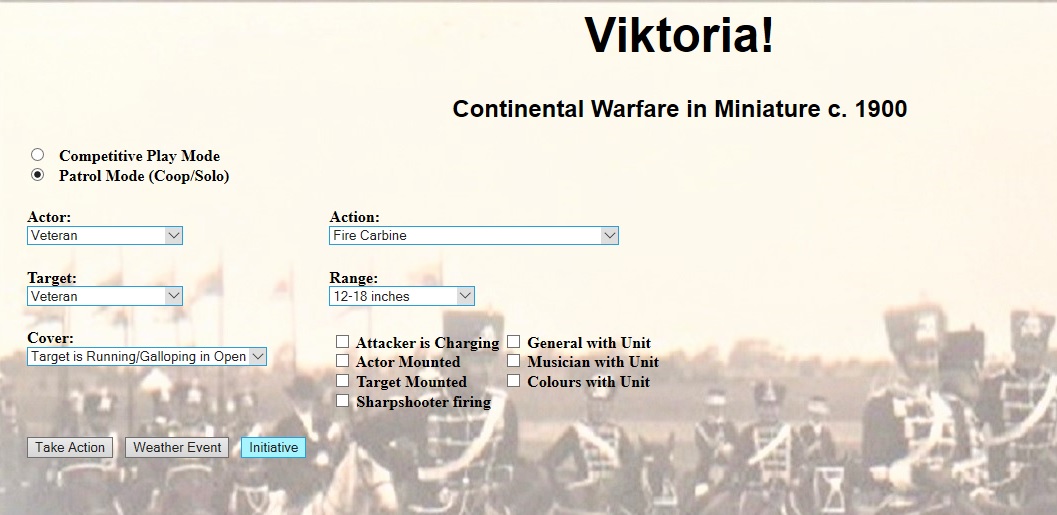 The Actor field is set to "Veteran" because the jagers are Veterans. The Target field is set to "Veteran" because the Connaughts are also Veterans. The Cover field is set to "Target is Running/Galloping in Open" because that was the Connaught's last action, which makes them a slightly harder target. The Action field is set to "Fire Carbine" because that is what the jagers are armed with. The Range field is set tp "12-18 inches" which covers the measured range. None of the other fields need to be used, because there are no mounted firers or targets, and none of the firing figures is a Sharpshooter. Charges only matter for melees, not firing.