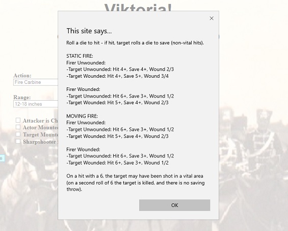 This might seem a little confusing at first glance: it is a table which is generated specifically for the firing which you have indicated with the game app settings. It covers a number of different cases where the firer might be doing a moving fire (after any movement during this action), might be shooting at wounded target figures, might themselves be wounded, or any combination of the above.