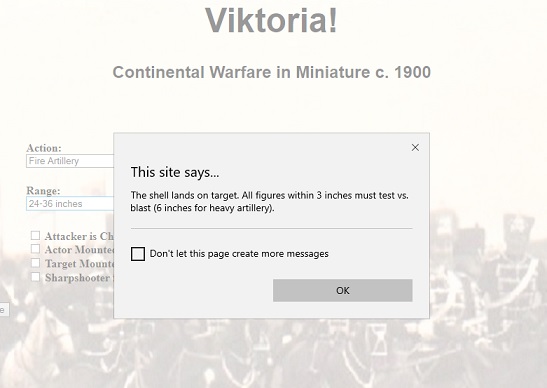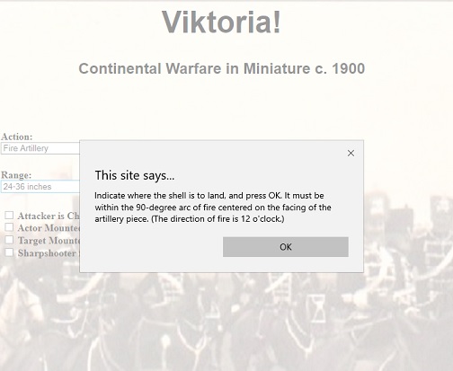 The Actor field is set to "Veteran" because that is the RAs rating. The Action is set to "Fire Artillery" and the Range is set to "24-36 inches". The fields describing the target are not used at this point - that is done once the fall of shell has been determined. For now, they can be anything and it makes no difference. The "Take Action" button is clicked, and the following message is received: