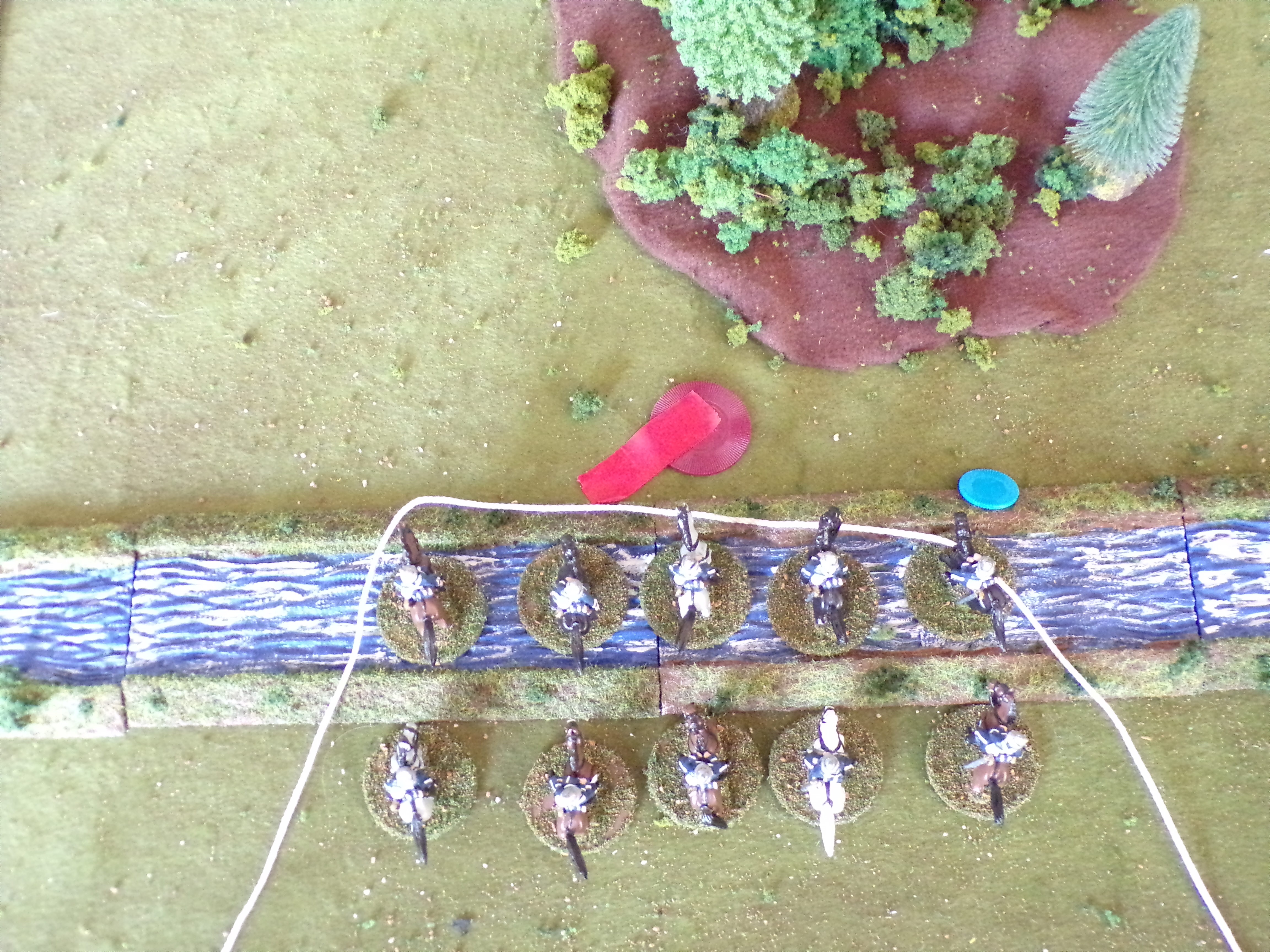We roll a normal die, divide by 2, and round up. The roll is a 5, so that becomes a 3. Three plus 14 is 17, so each figure in the unit has a base move of 17 inches. The player says they will advance straight across the stream, but because each inch of stream being crossed costs double, the front rank of figures only get half-way across. We put a blue chip on them to show that they have acted this turn (once all units on the table have acted, the turn is done, and all the blue chips get picked up).
