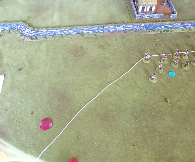 The red poker-chip shows the center of the Carabineer's front, and the red tape shows the direction of Northeast. We follow this pointer Northeast until we reach the table edge. We measure from this point on the table edge to the closest friendly unit - in our case, the Connaughts - and determine a point 17 inches away from the Connaughts along the Northeast-pointing line. This is shown with a red poker chip in the picture below: