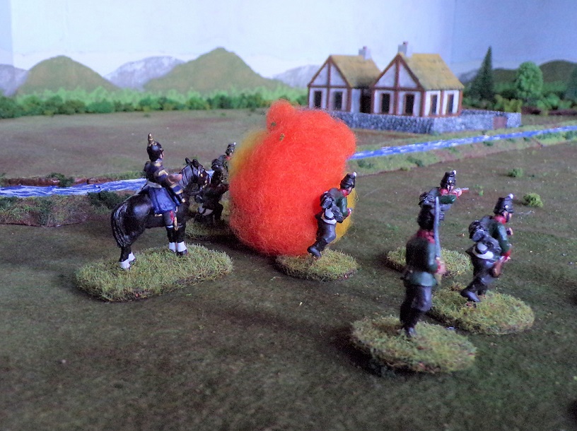 The next Initiative goes to the British, and they have only one unit left this turn to act - the Royal Artillery. Their choice of target is limited to what they can see, even though they are allowed to fire over the heads of intervening friendly troops. Since the enemy hussars are behind the wood, that leaves only the jagers. Artillery can pivot in place on a turn in which they fire, and it still counts as static fire, so that is what they do. The player decides that they will land a shell where it stands a chance of killing the enemy general as well as his soldiers (which would force them to check for out-of-command until a new general arrived, which would hopefully be a while!) The intended point of impact for their fire is indicated with a blob of fiery yarn: