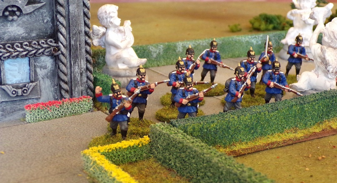 Marauding Prussians deploy in the garden at Lord Balfour's country estate.