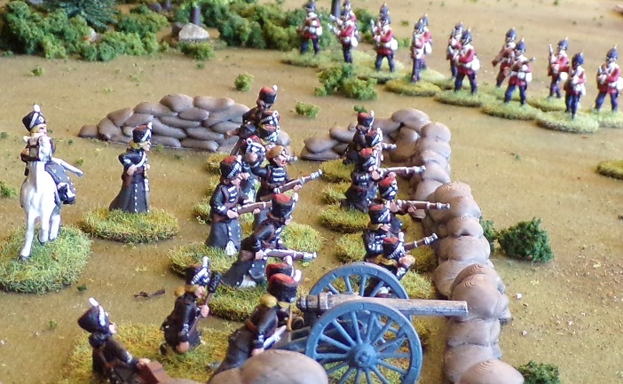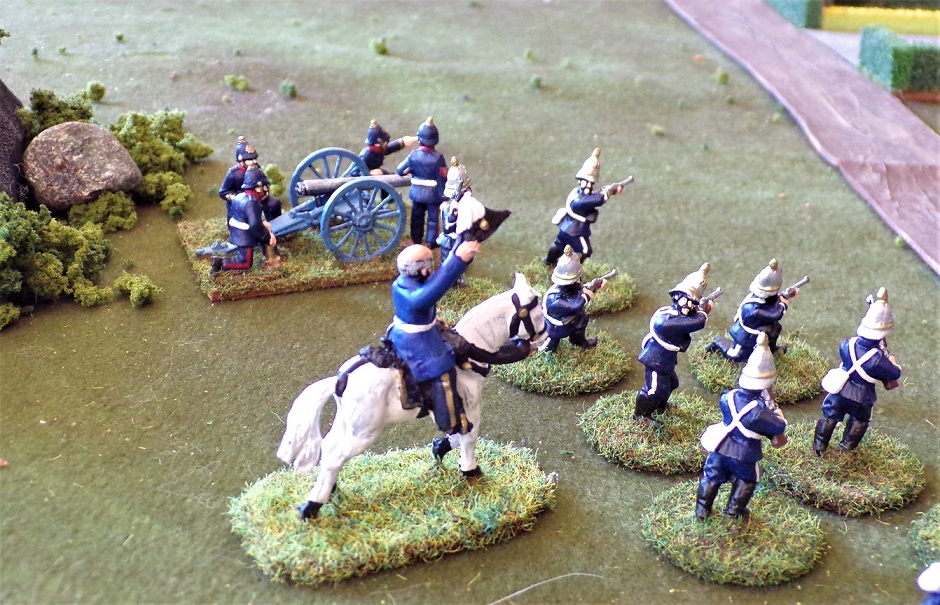 This system does not require specific types or sizes of enemy or player units, since these will be different for each player's collection. Instead it uses the concept of a "unit" of one of several types. It is up to players to decide what a unit will be for their game. (Typically, we use 12-24 figures for an infantry unit, 6-12 figures for a cavalry unit, a gun and 4 gunners for artillery, a machinegun and 3 crew for a machinegun, and artillery observer teams of 2 or 3 figures. Each command of 4-6 units will have a general, and might have a musician and standard-bearer in one of its infantry or cavalry units, and maybe a Medic unit.)
