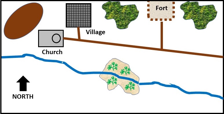 The tabletop is shown below. The Fort is a wooden stockade which will provide hard cover to units inside it (maximum of 1). The Church and town will both provide soft cover (they are made of wood and stucco, primarily, with low walls, etc. not designed for defence). Movement inside the village uses rough movement rates, unless the moving unit is in column. The woods and hill are both rough and provide soft cover. The marshy area is rough, but provides no cover and does not block line of sight. The stream is rough but fordable at all points, but will give an "uphill" bonus to troops defending a far bank from an attacker.