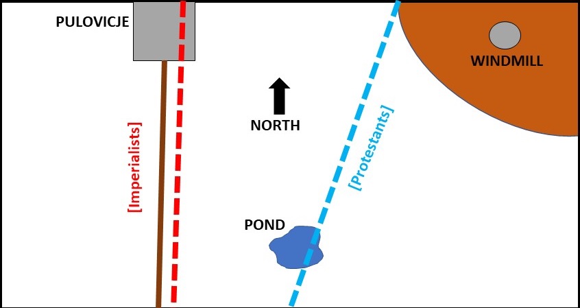 Opposing sides set up on or behind the dotted lines - Imperialists to the west, and Protestants to the east.