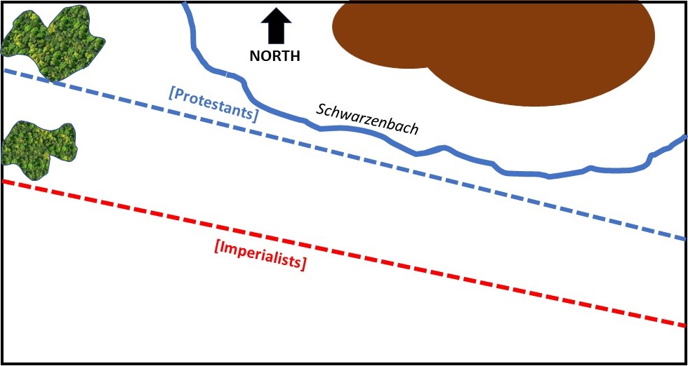 The Protestants set up first, anywhere north of the blue dotted line on the map. The Imperialists will set up second, and are the attacker for the scenario. Forces should not be within musket range (12 inches) at the start of play.