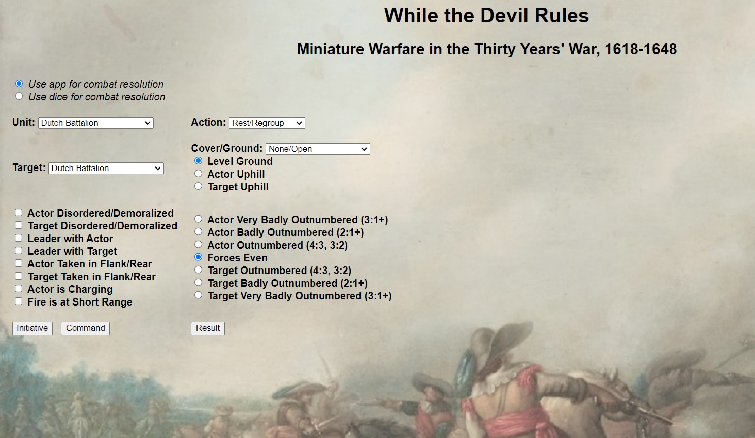 While the Devil Rules is designed to refight the field battles of the Thirty Years' War and the conflicts of the mid-17th century in Scandanavia and eastern Europe such as the "Swedish Deluge." Incidental to this, it can be used also for the Franco-Spanish War, the later Eighty Years' War, and the English Civil War. This period saw the ultimate expression of pike & shot warfare, with units combining both arms in an integrated fashion. While cavalry was not as powerful as it had been, it was still present in huge numbers, and played a critical role on the battlefield.