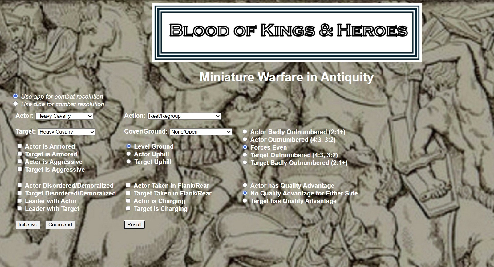 The game app performs all calculations, giving players the choice to do their own dice-rolling or have the device do it for them. Initiative passes back and forth between sides frequently, to keep players engaged. The app itself is simple, with only a single screen (depicted below), and serves to speed play. It can be run simultaneously on more than one device for large games.